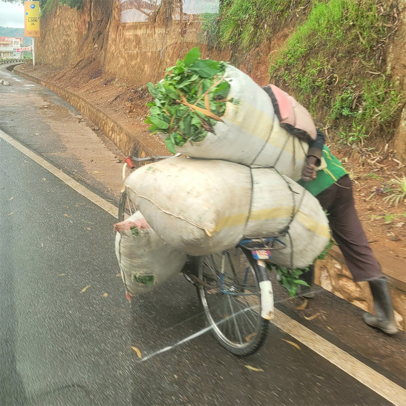 Auch auf dem Land gibt es wichtige Märkte, die den Lebensunterhalt vieler Familien sichern. Besonders beeindruckend sind die Transportmittel für die Güter, wobei Fahrräder eines der wichtigsten sind. Es ist eine Herausforderung, zu sehen, wie viel darauf passt. Ferner werden Güter auf den Köpfen getragen. Das größte Gut, das ich auf dem Kopf eines Menschen transportiert sah, war ein ganzes Sofa.